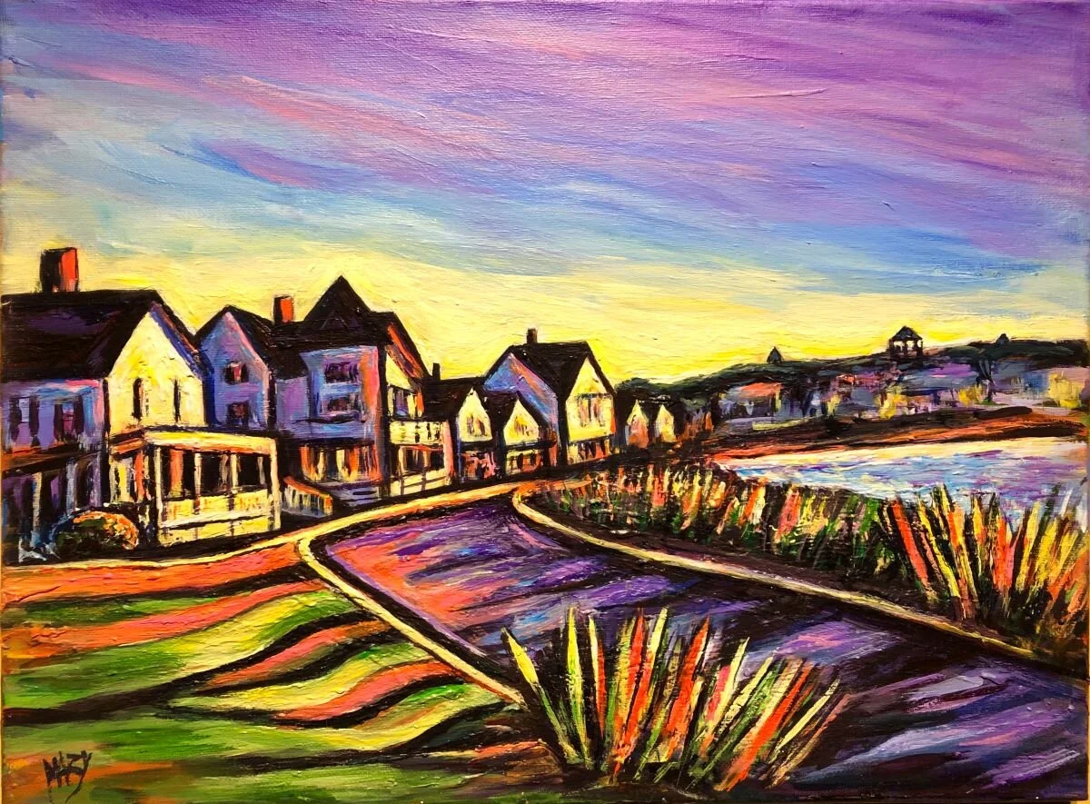Contemporary original New England seascape acrylic painting on stretched canvas of a road lit up at dusk in a seaside town. Unframed 12 x 16 x 5/8