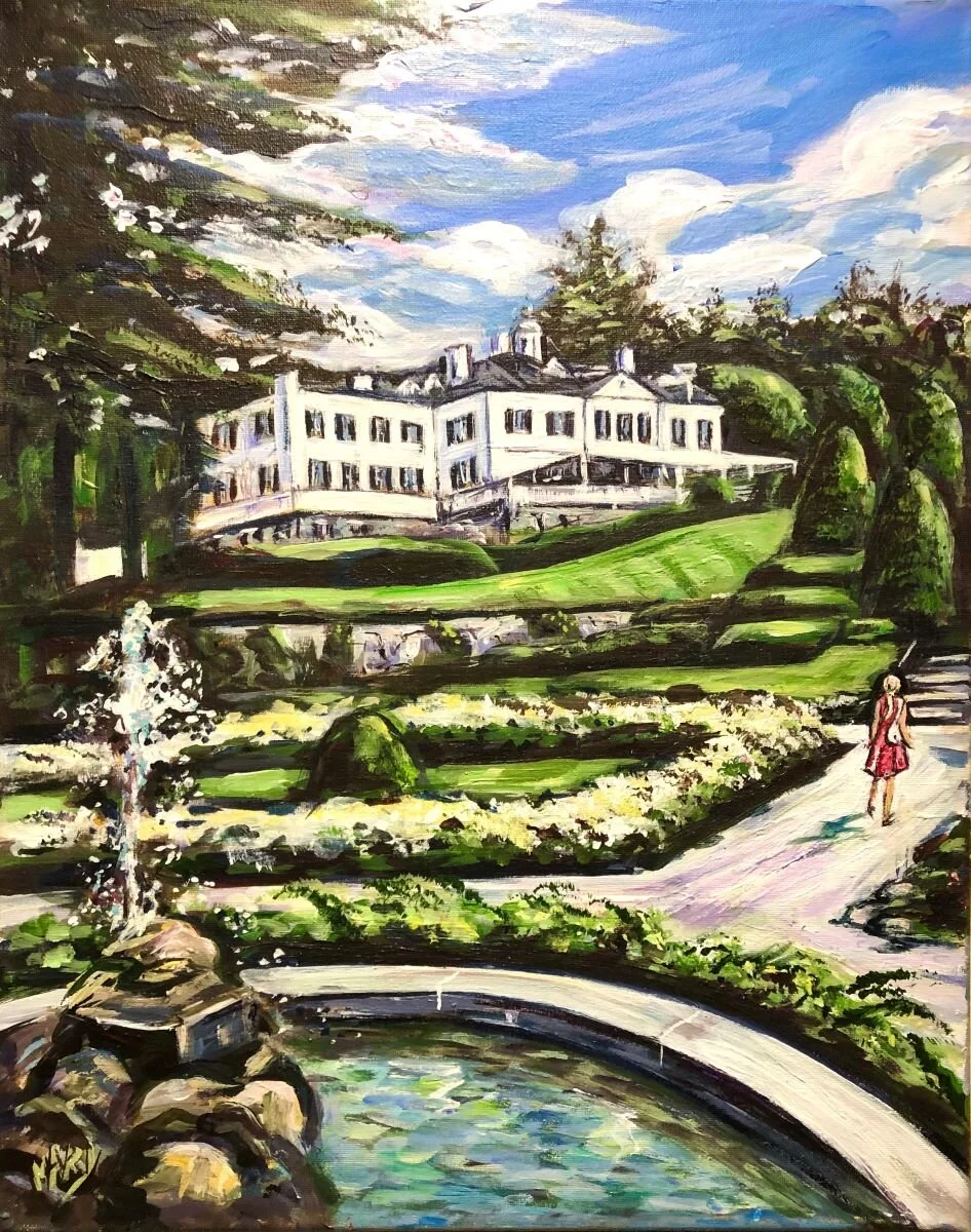 Contemporary original New England landscape acrylic painting on stretched canvas of the mansion at The Mount in Lenox, Massachusetts. Unframed. 20 x 16 x 5/8
